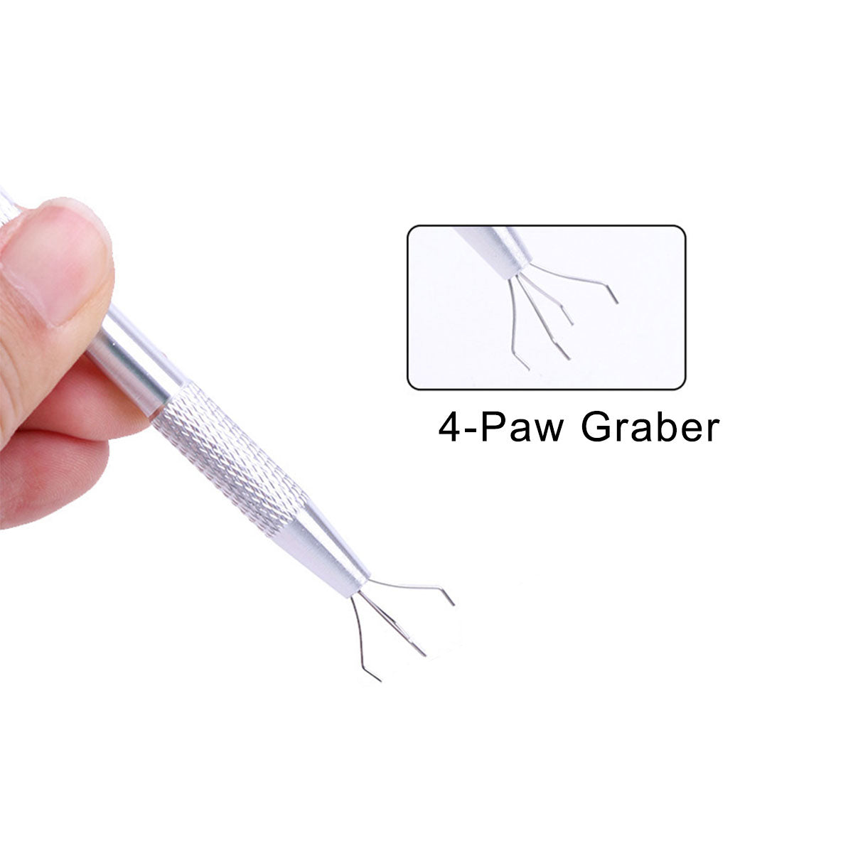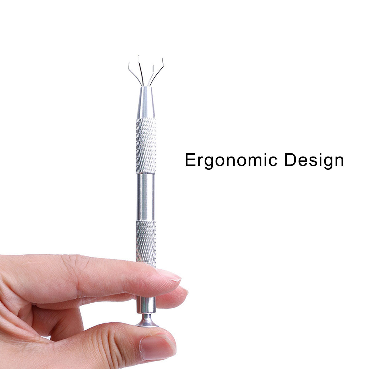 This precision 4-prong grabber tool features adjustable spring-loaded jaws that securely hold delicate components of any size – from tiny IC chips and BGA sockets to jewelry stones and nail art sponges. The deeply grooved handle with diamond-pattern texture delivers a non-slip grip, preventing slippage during intricate operations.