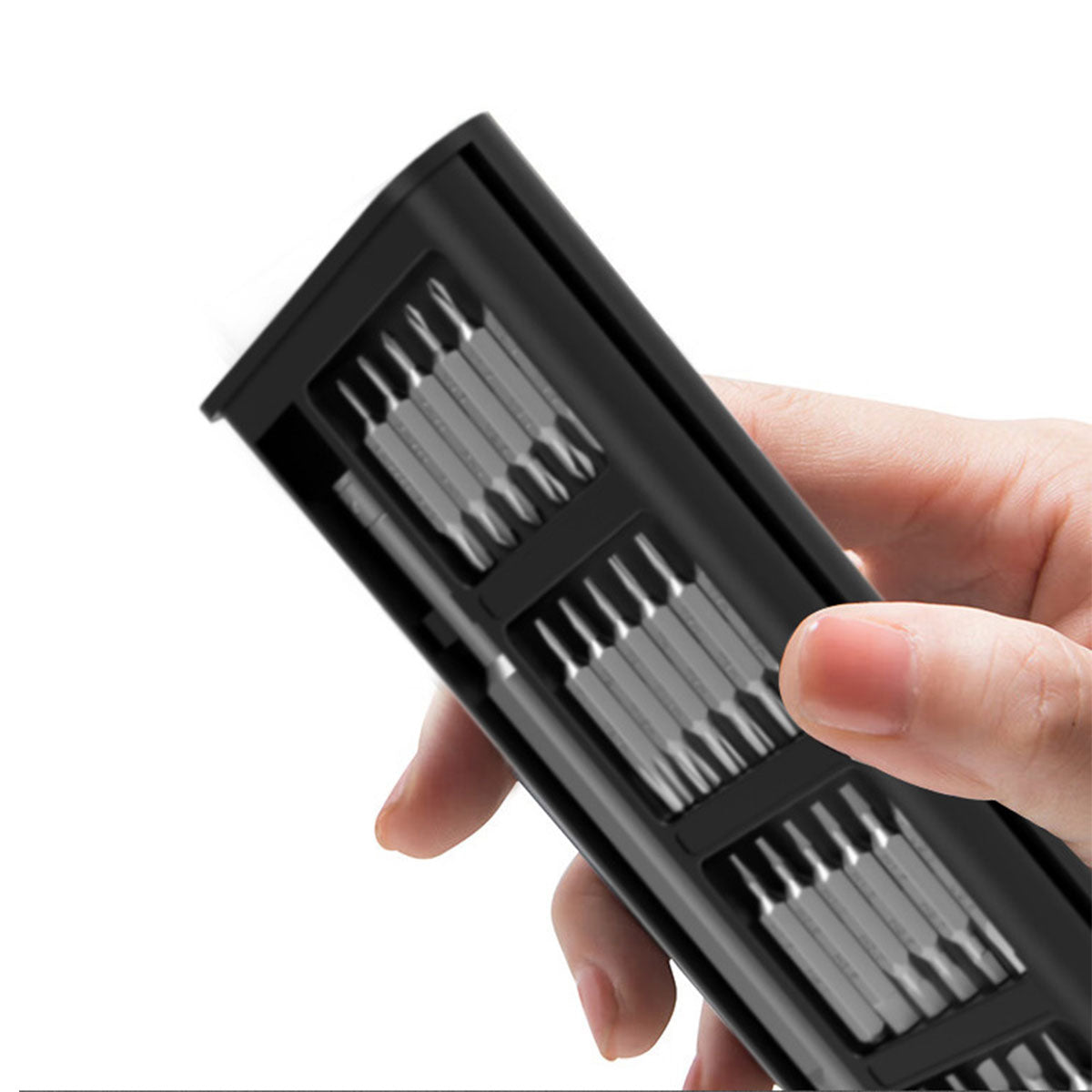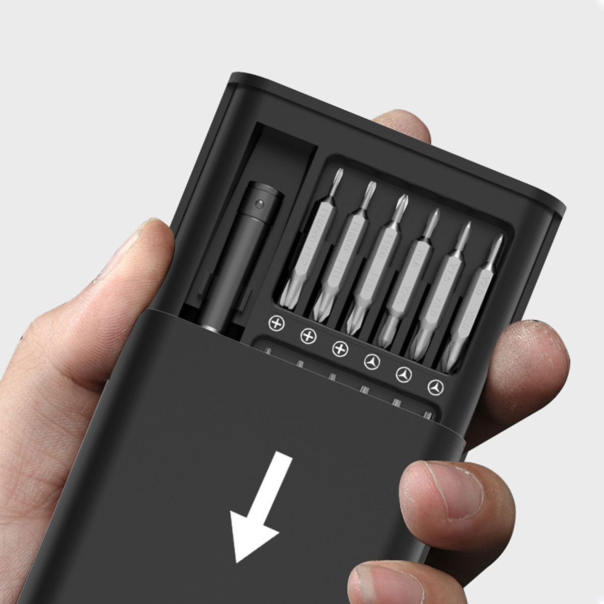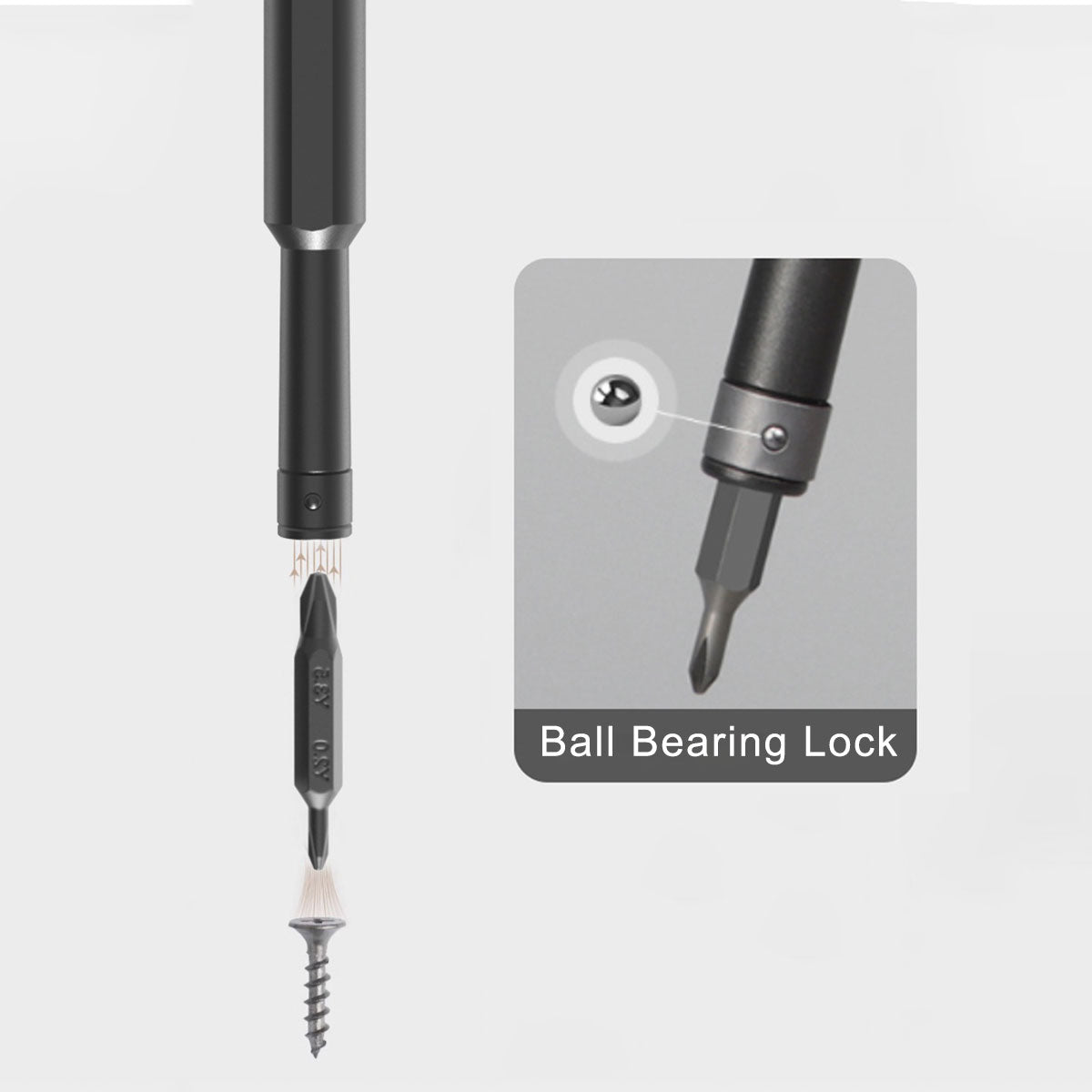 Toorium Magnetic Screwdriver Set, and its core component features an ergonomic aluminum handle with a 360° rotating-end-cap, an angled aluminum grip for enhanced comfort and performance, with a Ball Bearing Lock mechanism for secure bit retention.